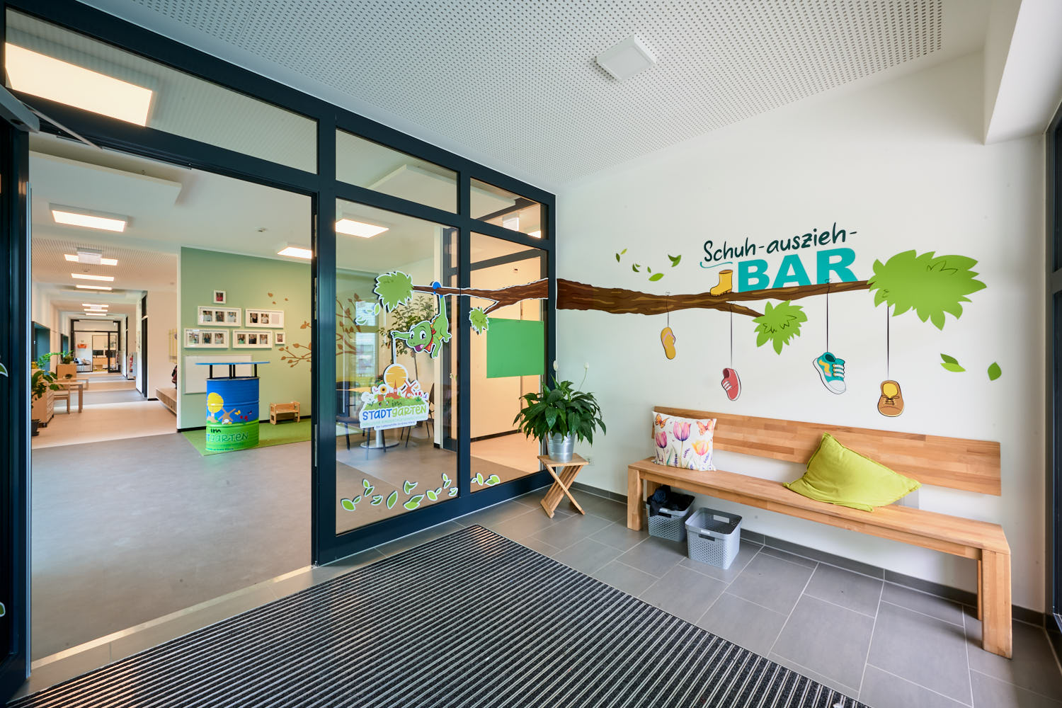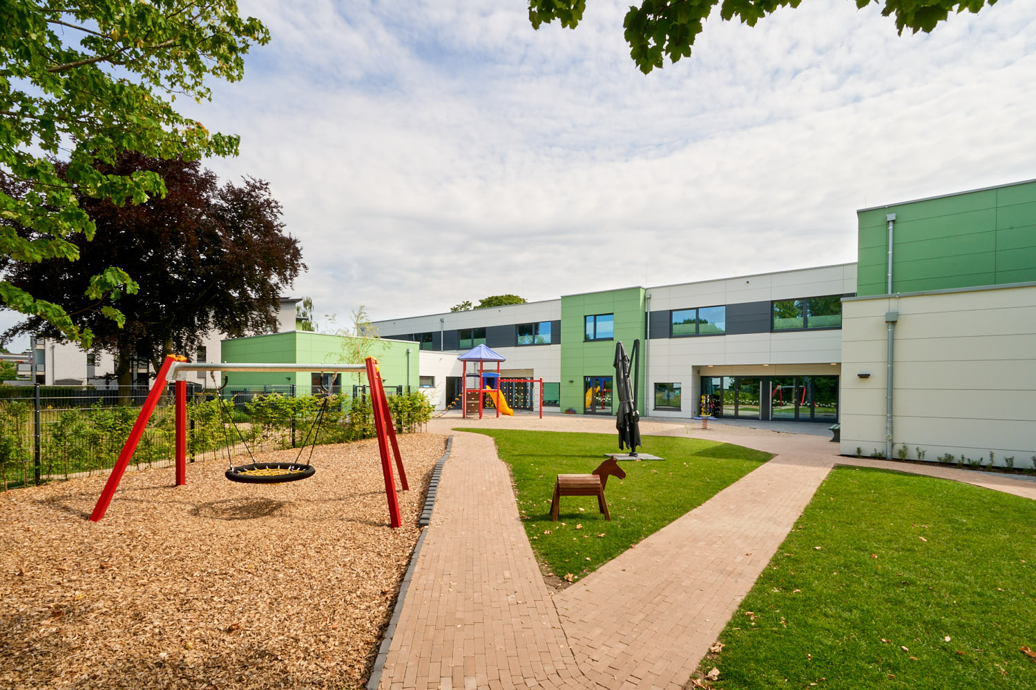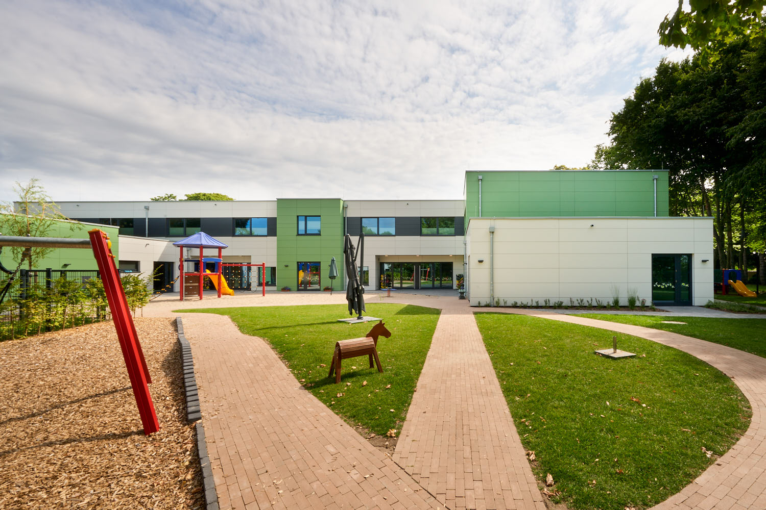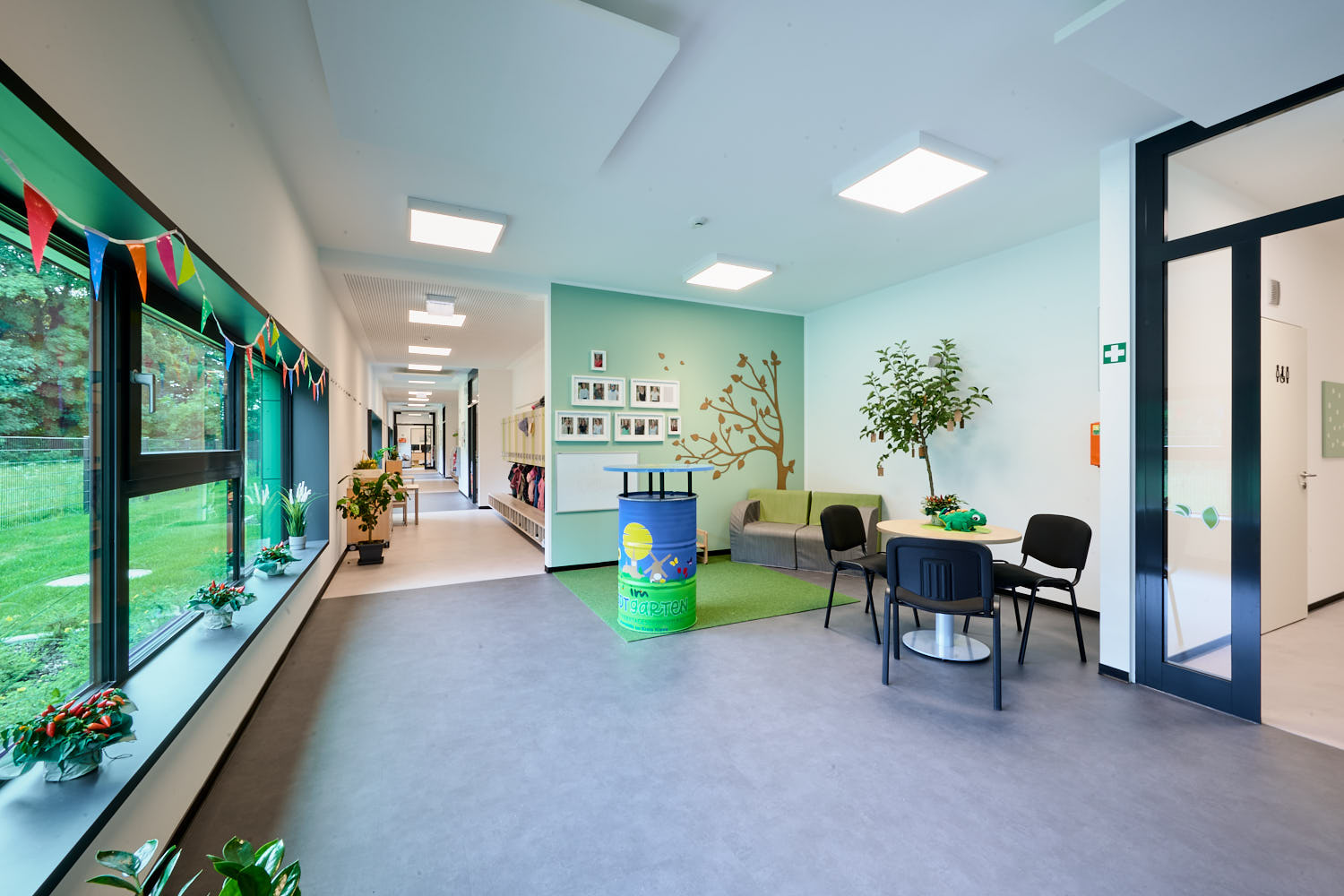 Neubau einer 4-gruppigen Kindertagesstätte im Erdgeschoss und einer Frühförderstelle im Obergeschoss. Als Besonderheit dieses Projektes kann und muss genannt werden, dass dieses Gebäude den Anforderungen nach DGNB (Deutsche Gesellschaft für nachhaltiges Bauen" und nach QNG (Qualitätssiegel Nachhaltiges Gebäude) errichtet wurde.