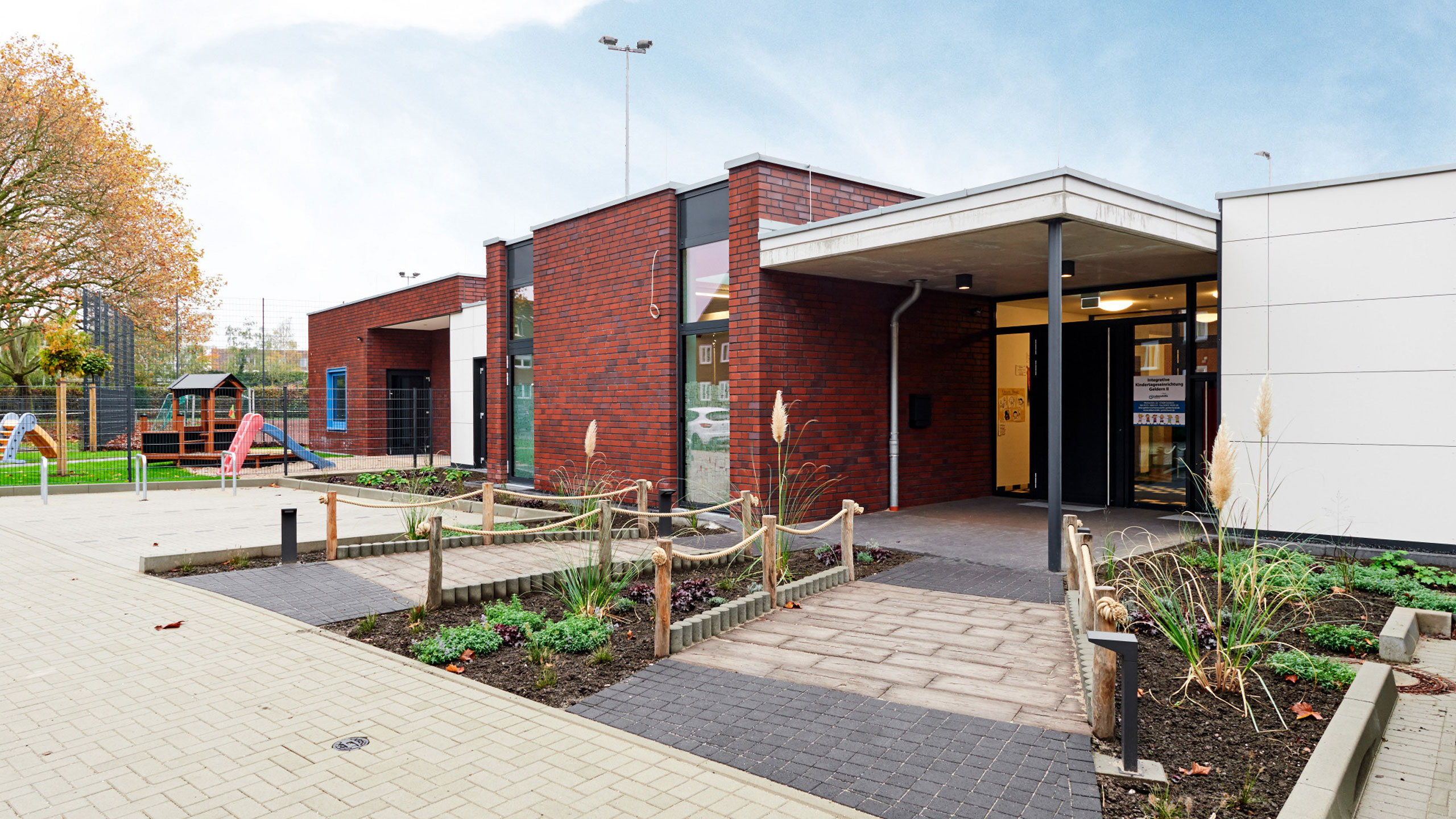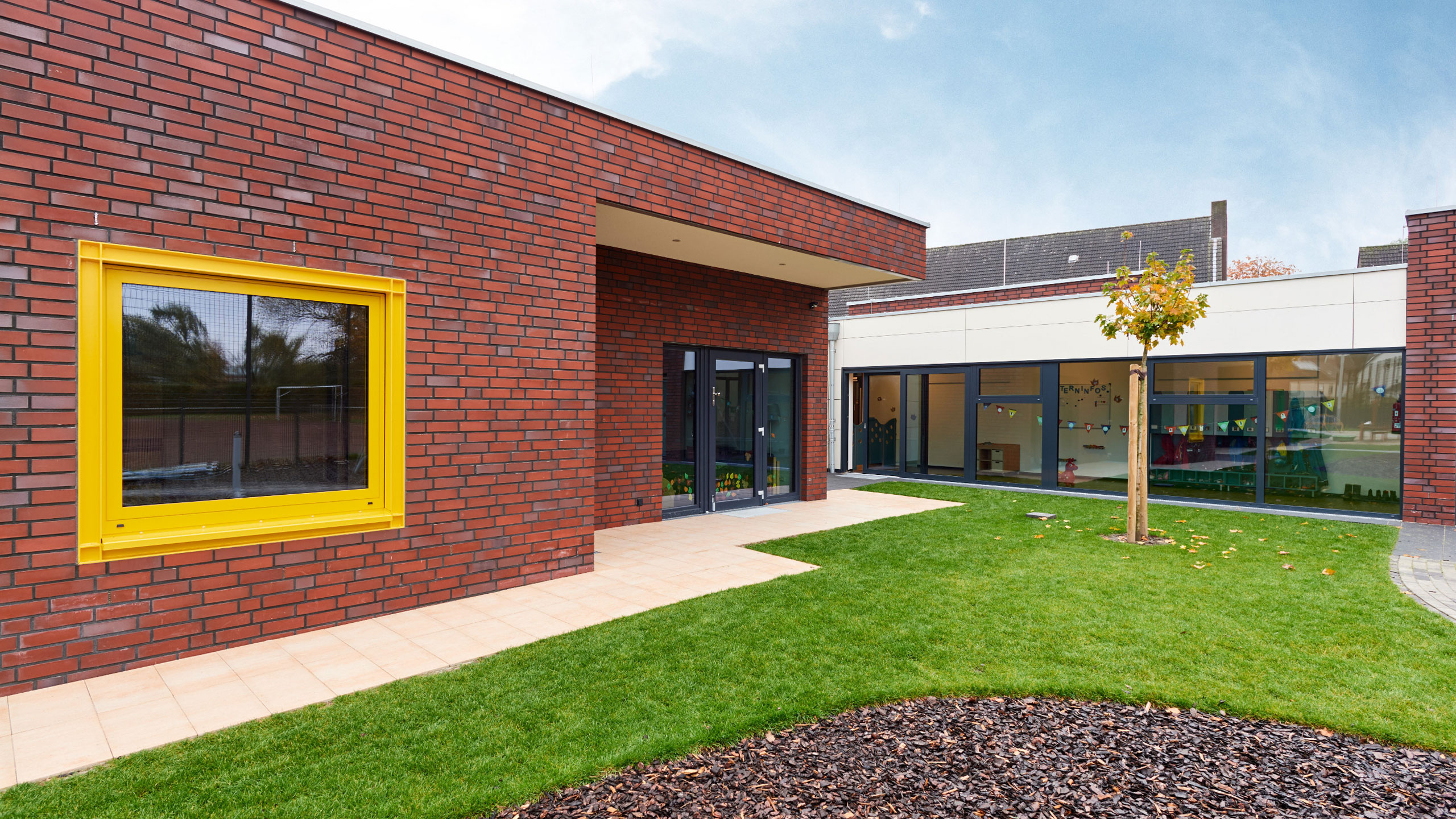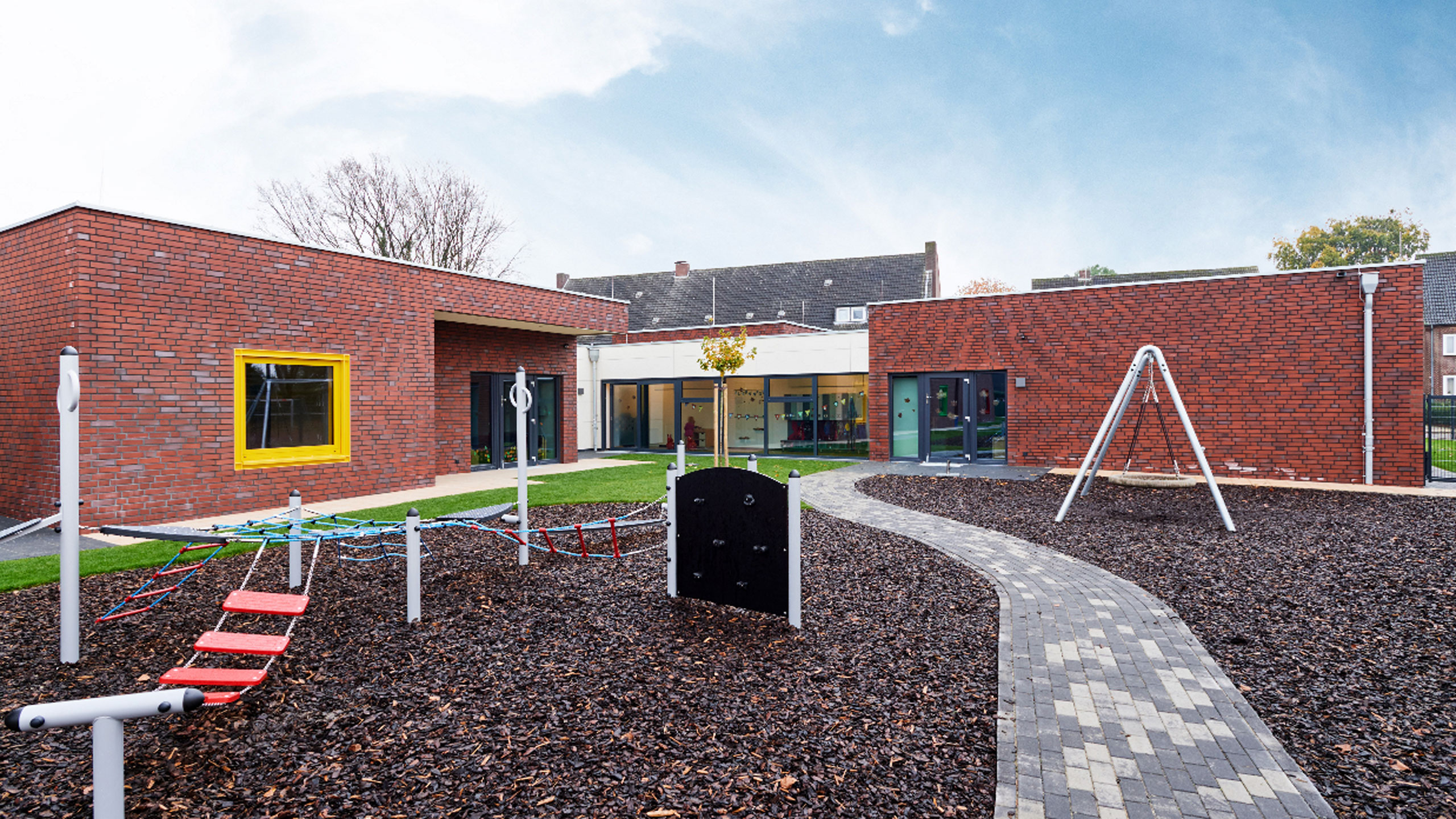 Die 4-gruppige Kindertagesstätte in Geldern verbindet klare architektonische Strukturen mit einer kindgerechten Raumgestaltung.  Jede Gruppe erhält ihren eigenen Raum mit direktem Bezug zum Außenraum und fördert so ein offenes, lebendiges Gesamtkonzept.