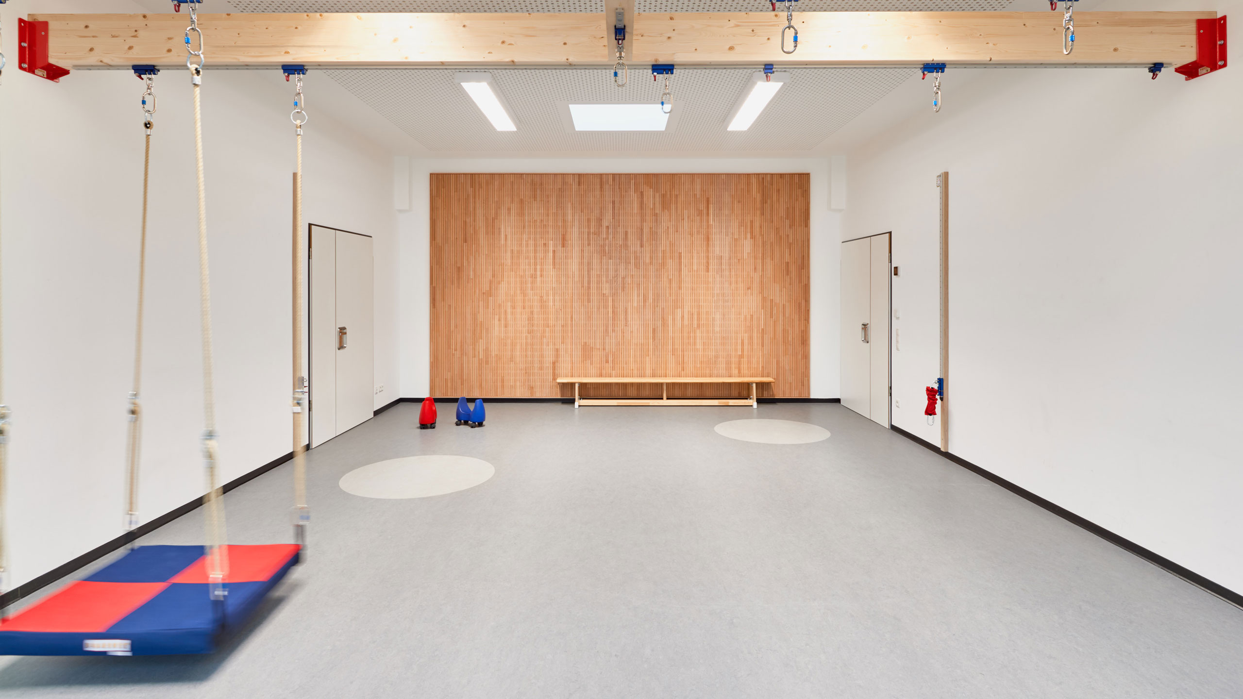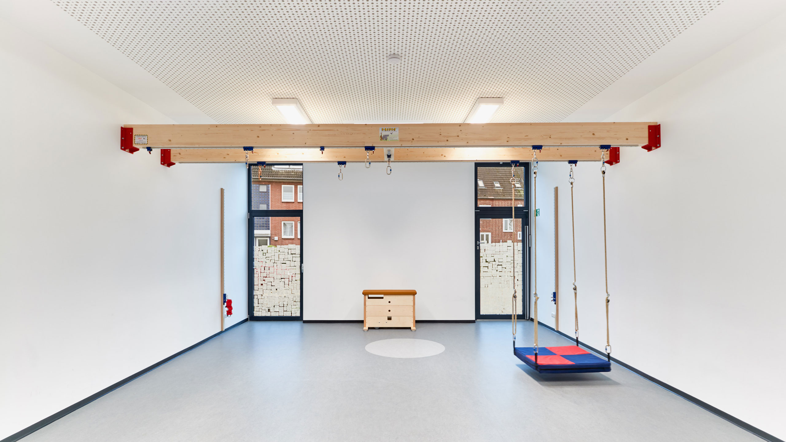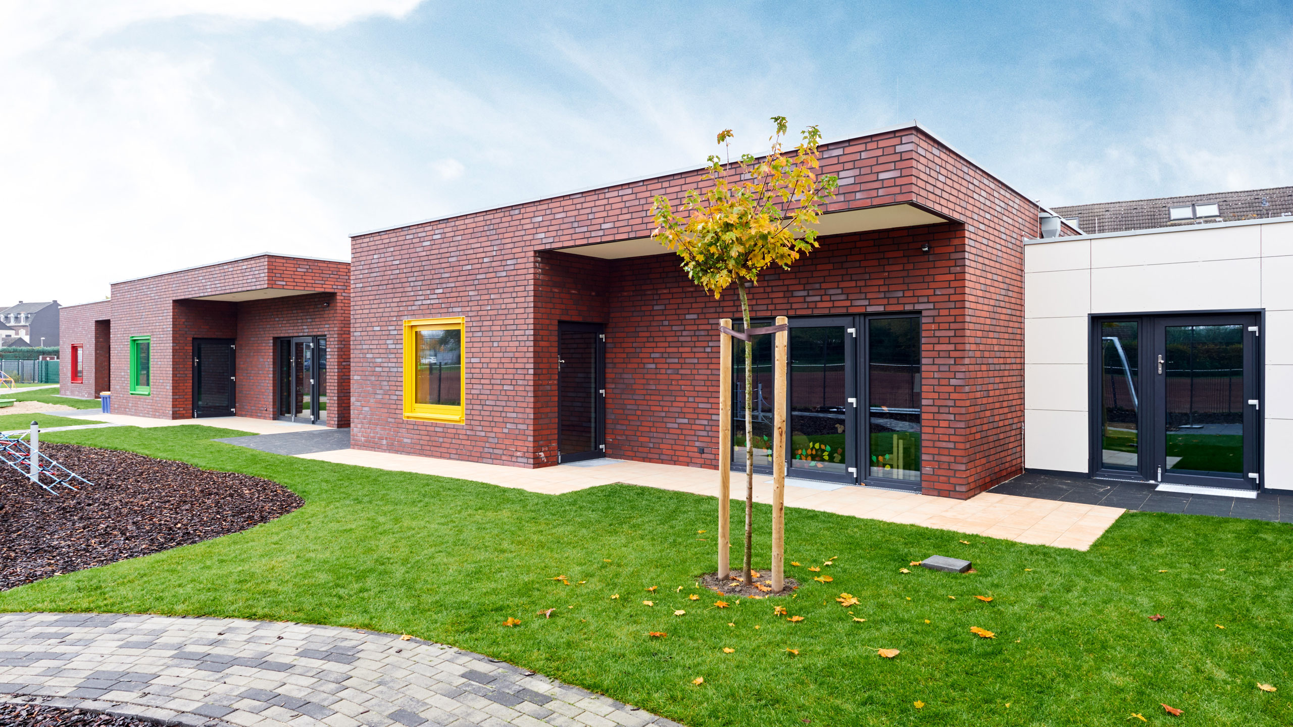 Die 4-gruppige Kindertagesstätte in Geldern verbindet klare architektonische Strukturen mit einer kindgerechten Raumgestaltung.  Jede Gruppe erhält ihren eigenen Raum mit direktem Bezug zum Außenraum und fördert so ein offenes, lebendiges Gesamtkonzept.