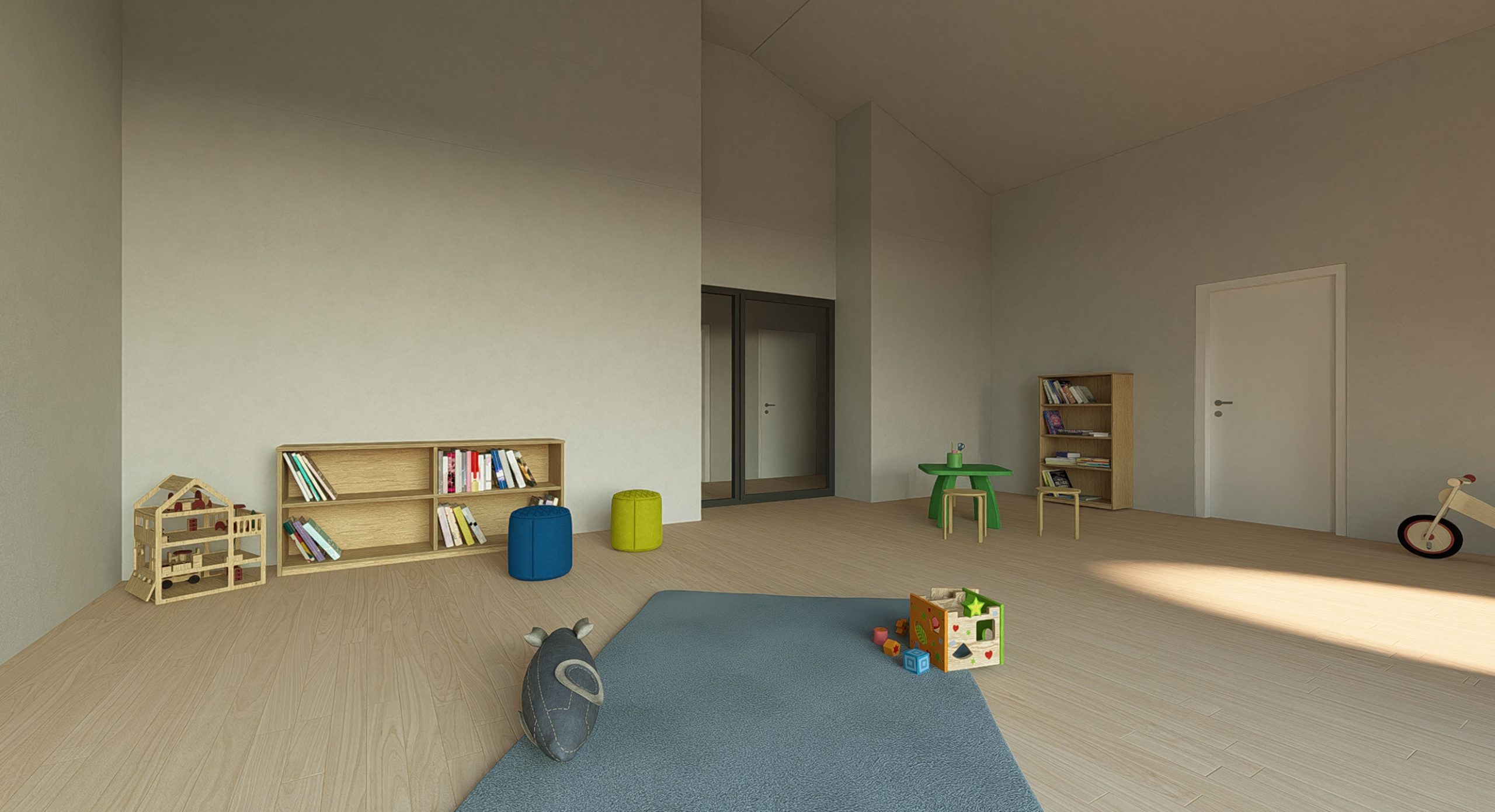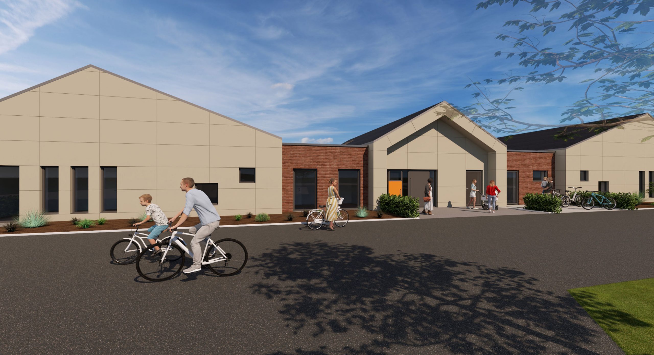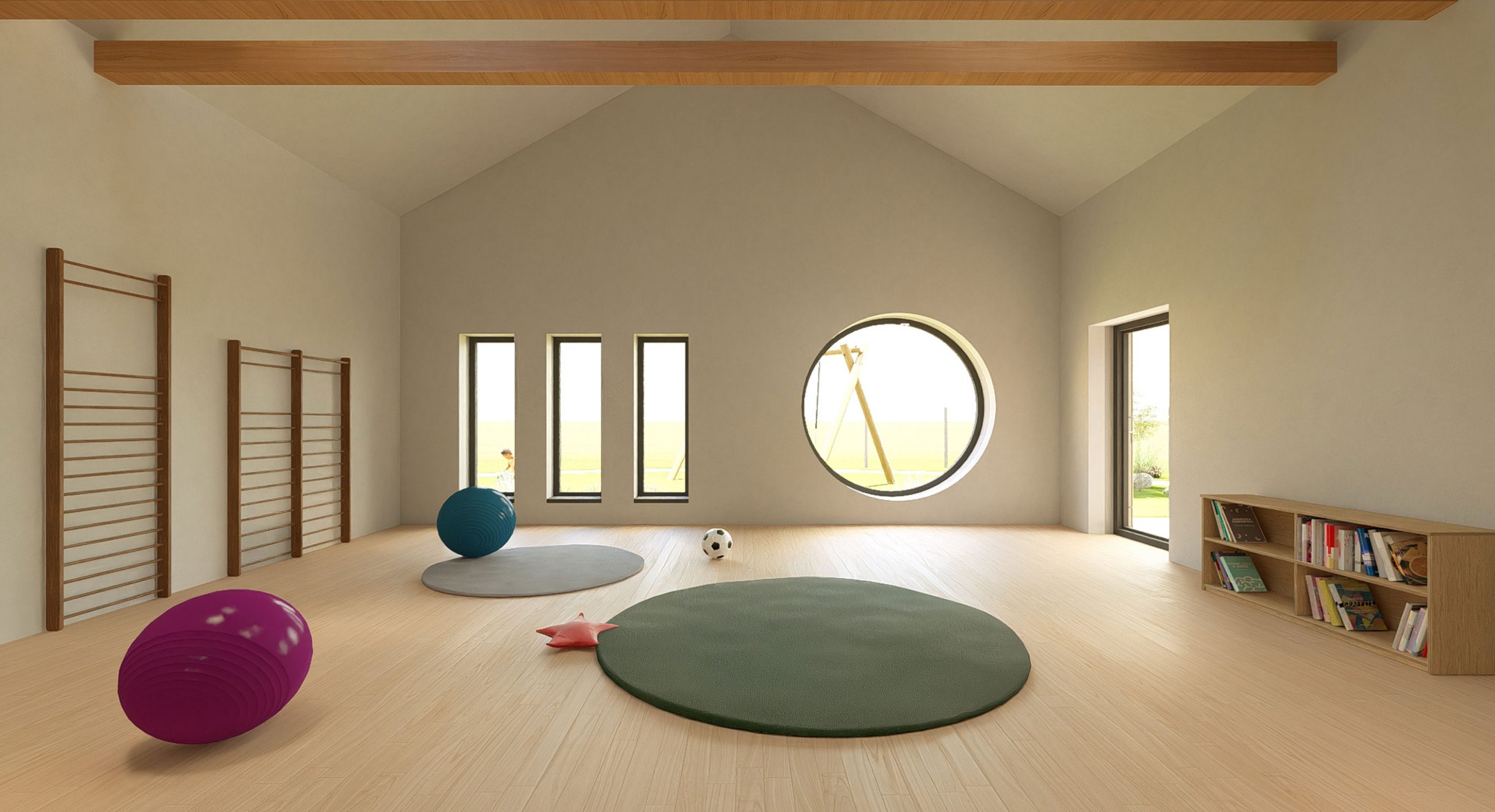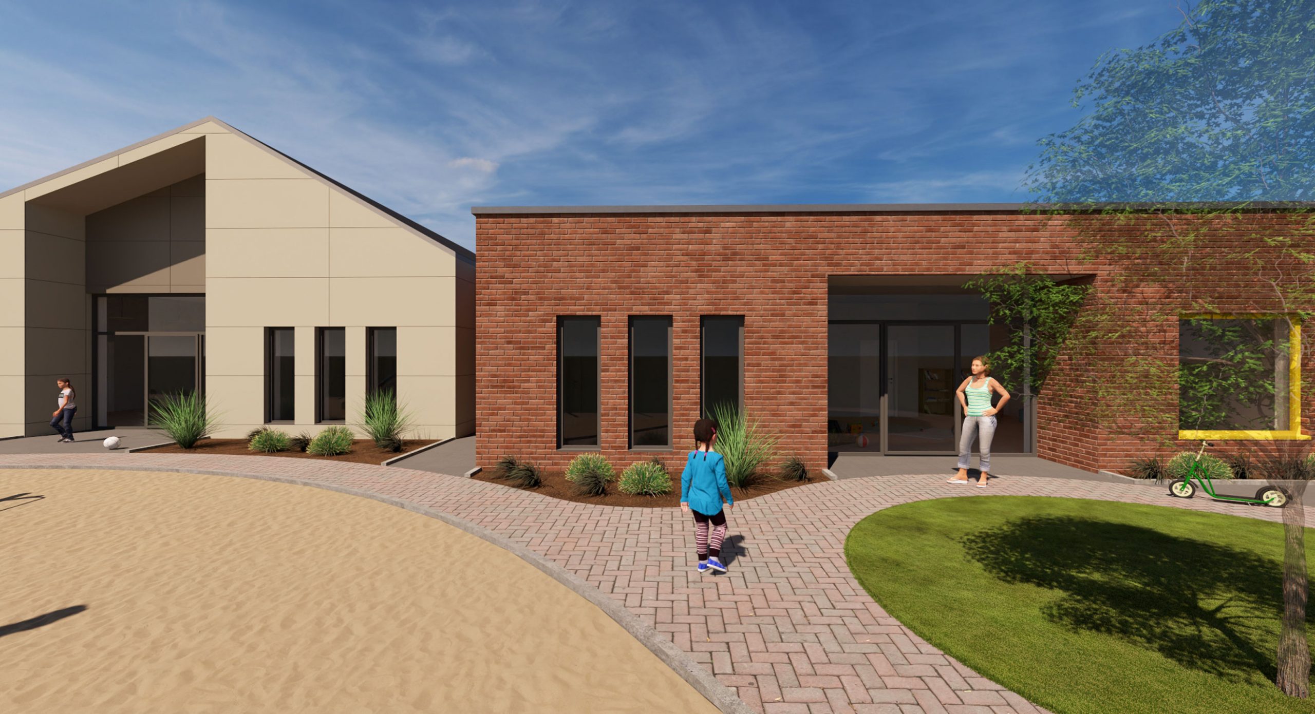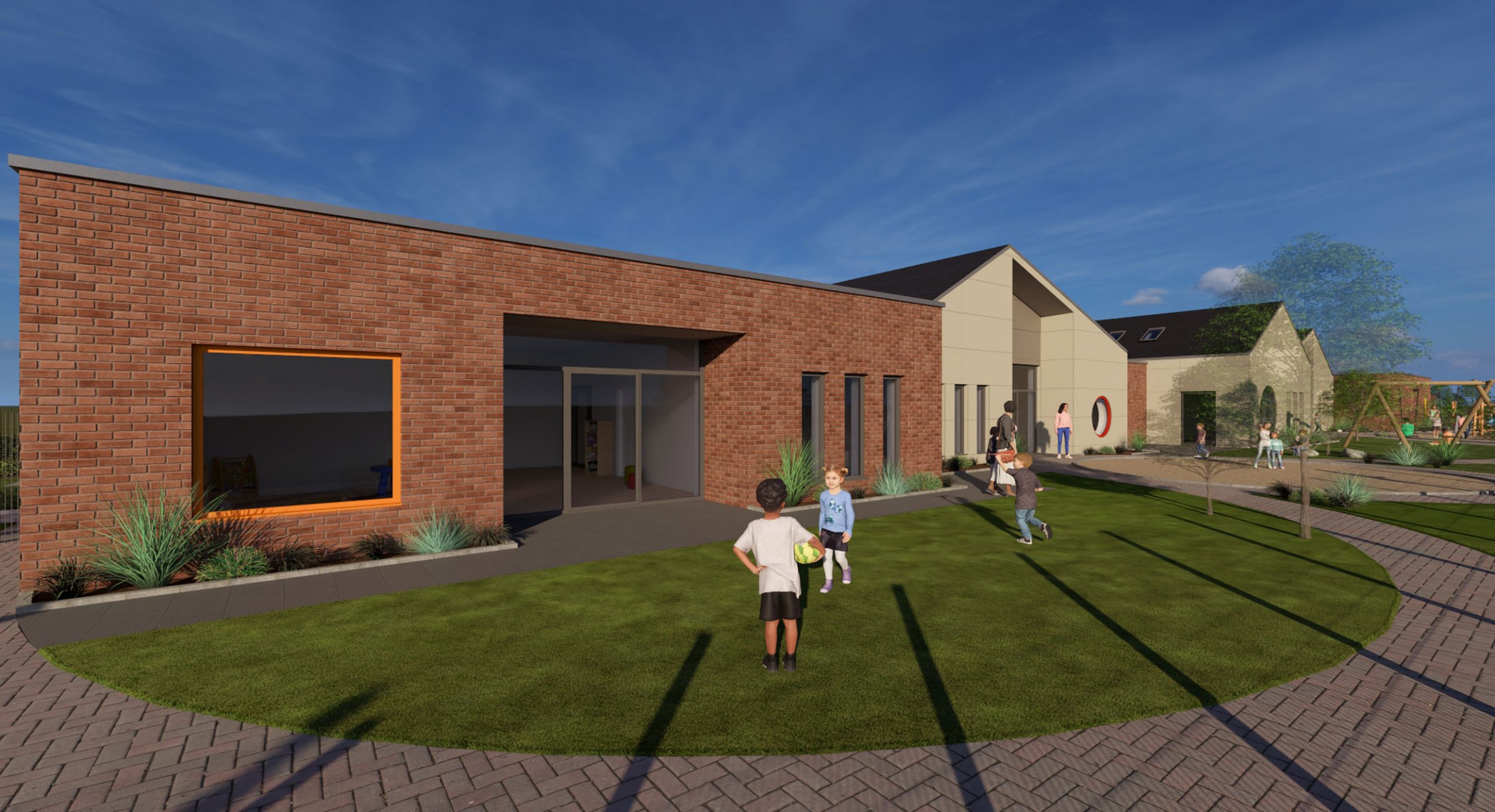 Neubau einer 4-gruppigen Kindertagesstätte in Goch-Hassum mit kindgerechter Architektur. Runde Fenster auf Augenhöhe der Kinder und unterschiedlich geneigte Dächer setzen spielerische Akzente.